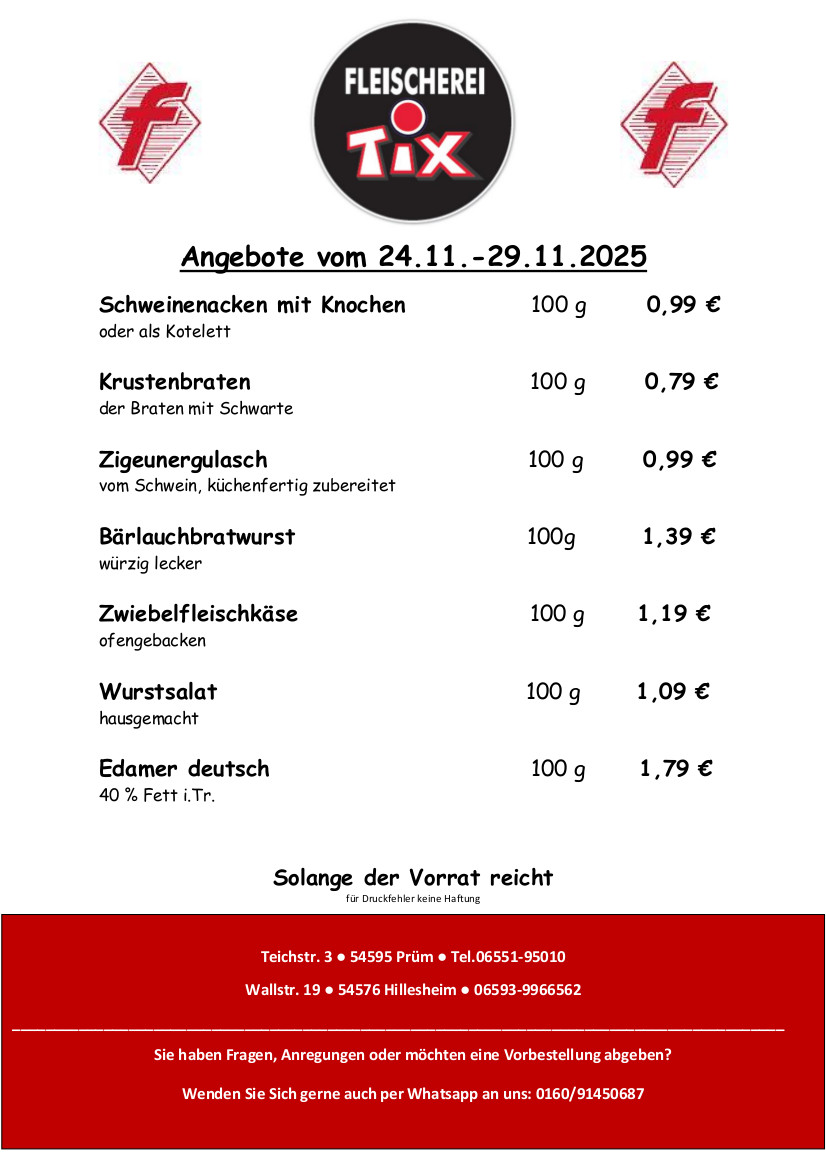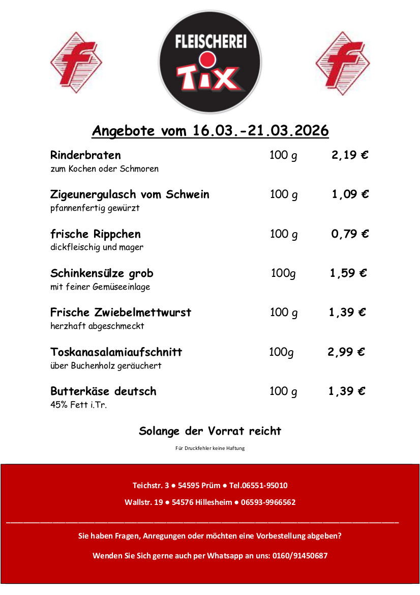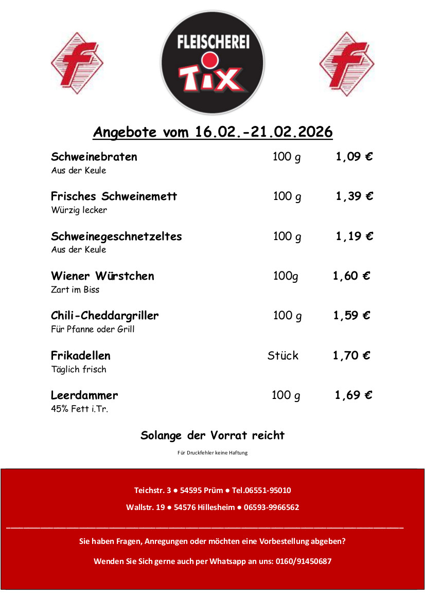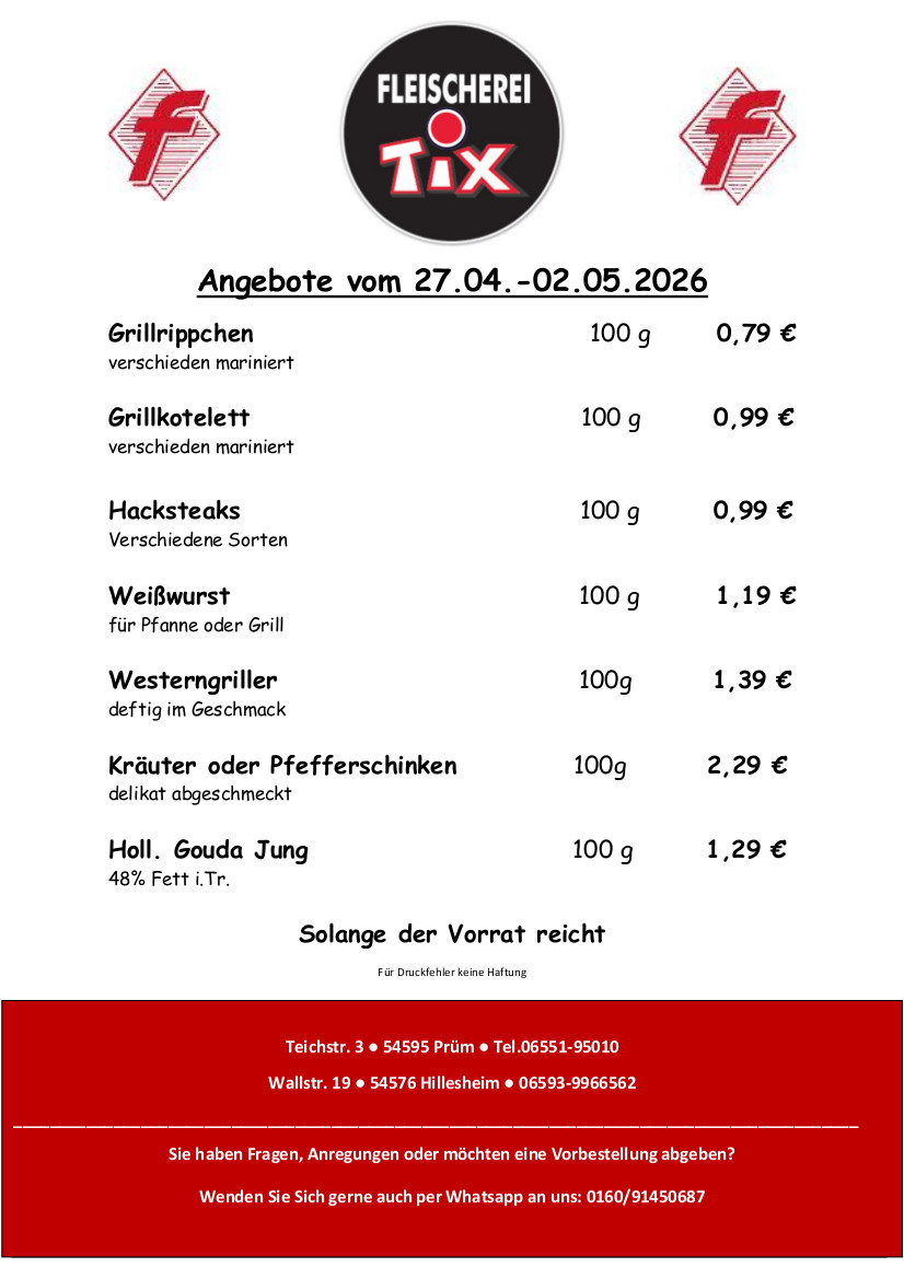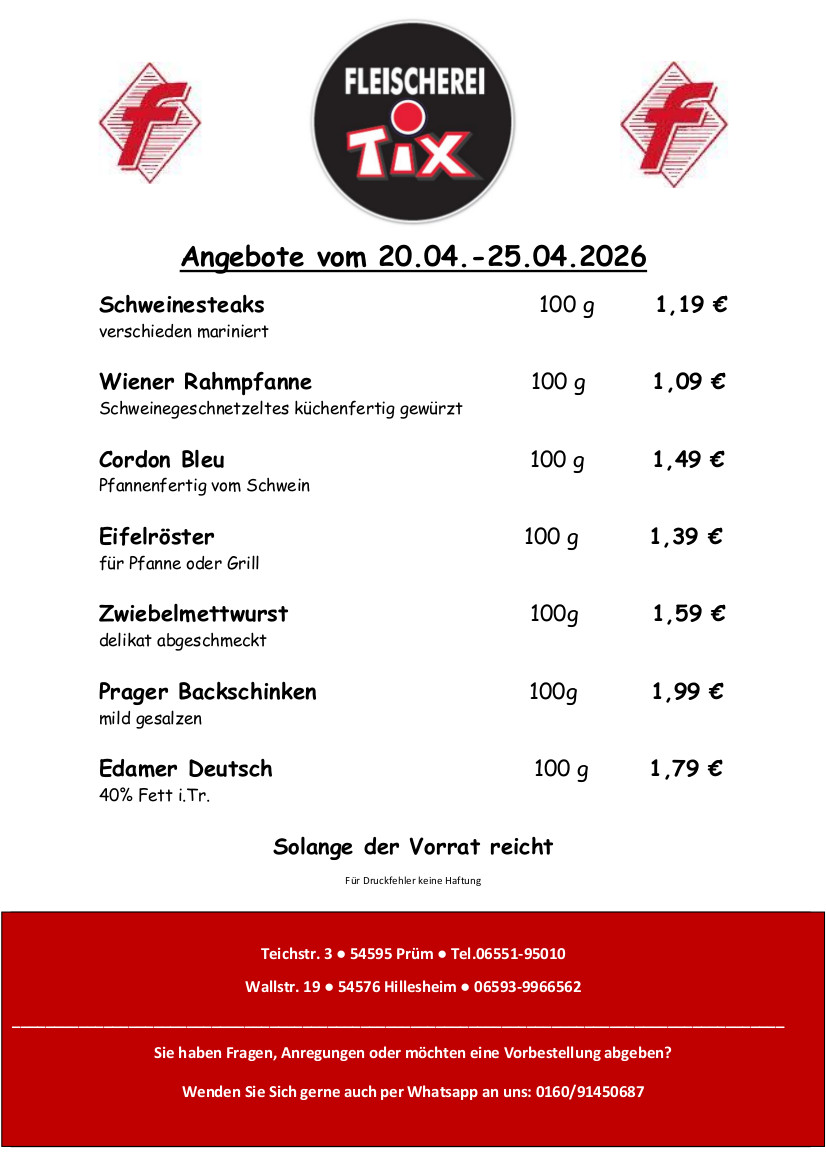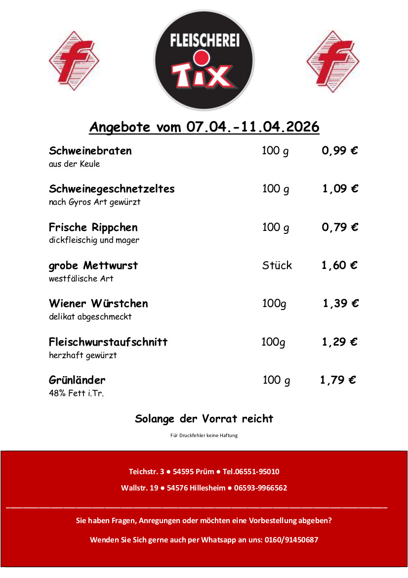 Wir sind Stefan und Christoph Tix, und wir führen zusammen die Fleischerei Stefan Tix, die ihren Sitz in Prüm hat. Das Unternehmen besteht bereits seit 1956 und wir sind stolz, diese Tradition in der mittlerweile 2. bzw. 3. Generation fortführen zu dürfen.